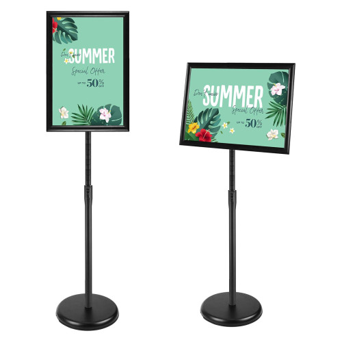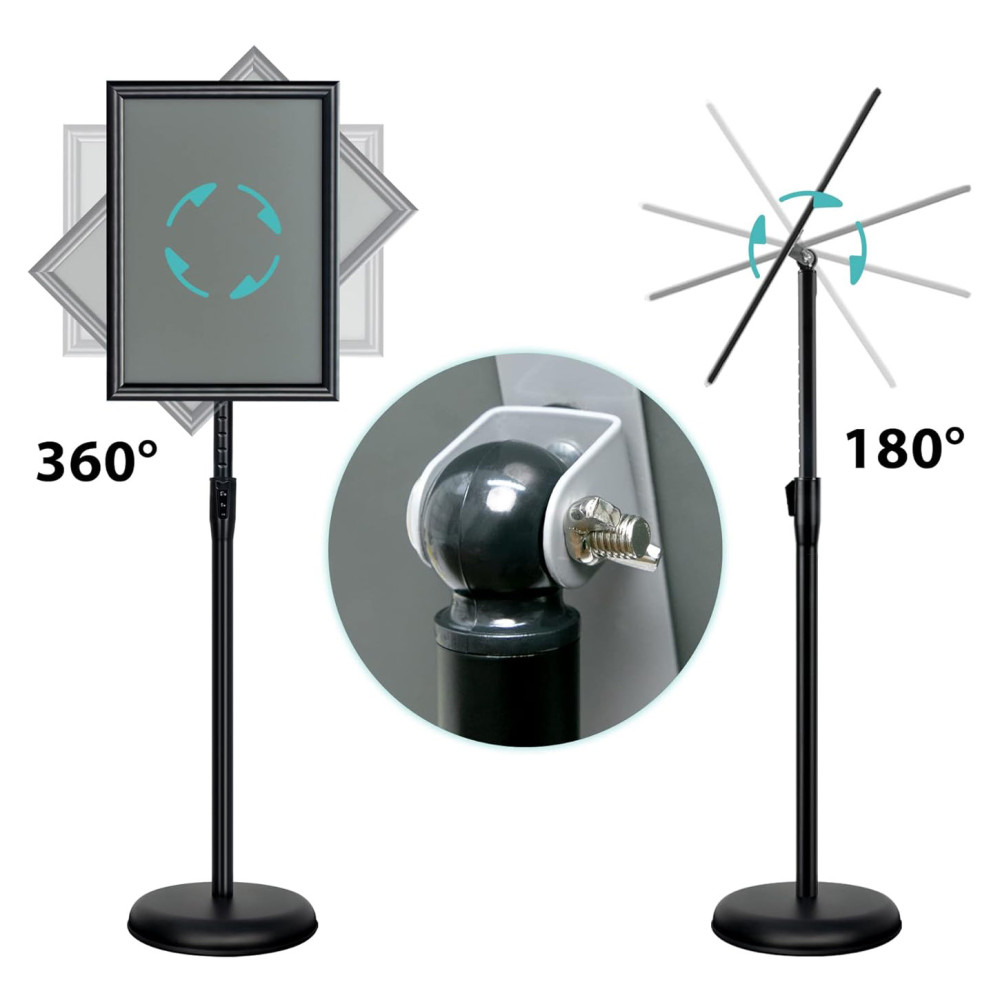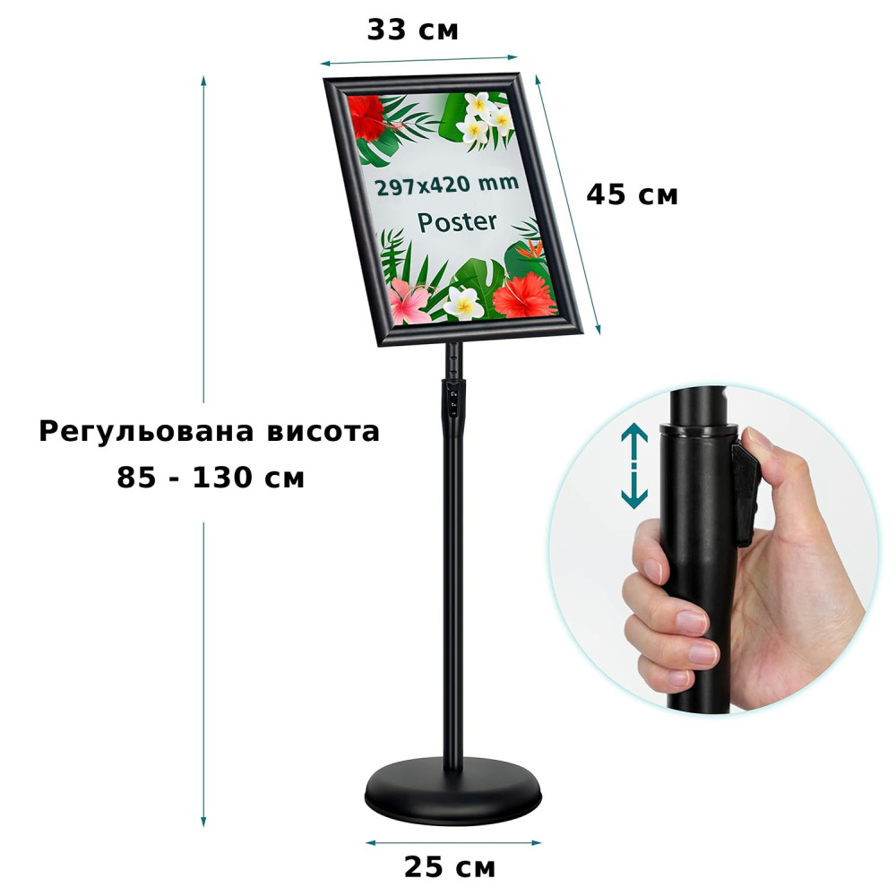 Телескопічний регульований меню-стенд формату A3 чорного кольору - максимально гнучкий. Можна довільним чином змінювати висоту стійки, кут нахилу рамки та її орієнтацію.