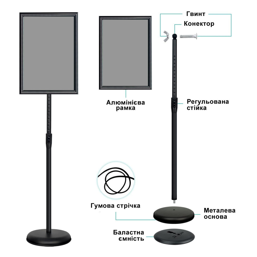 Металева основа стійки для меню укомплектована пластиковою баластною ємністю, яку можна наповнити водою або піском для змільшення ваги і більшої стійкості стенду, а також гумовим ущільнювачем, що захищає від ковзання.