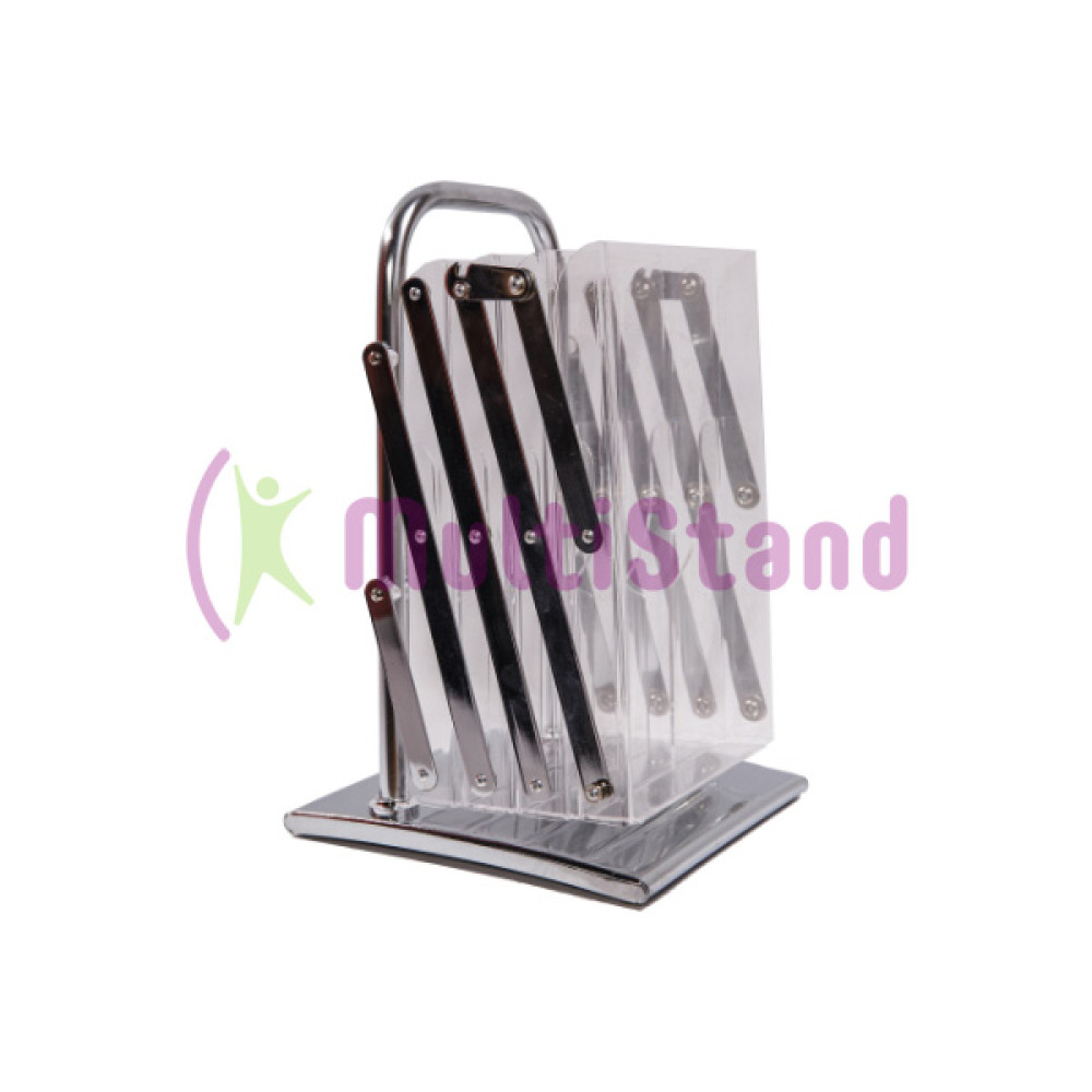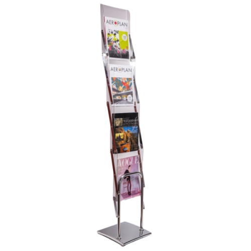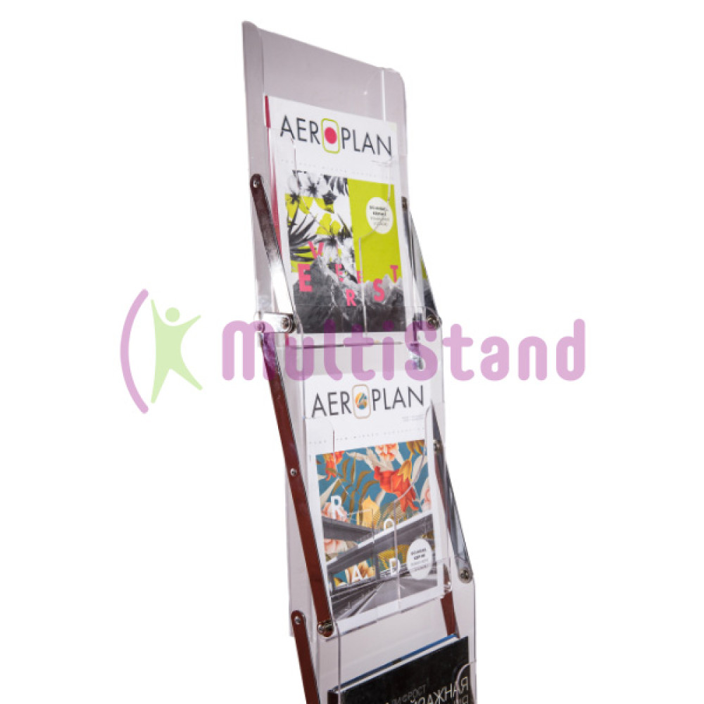 Стійка для буклетів з 4 акриловими лотками вертикальної експозиції, збирається та розбирається одним рухом руки. Можна скласти й упакувати в сумку, не витягуючи брошури з лотків.