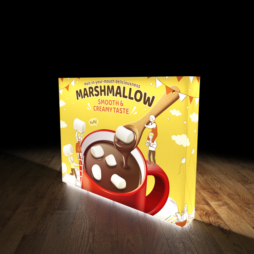 Каркас поп-ап стенду з внутрішньою підсвіткою забезпечений алюмінієвими профілями, що дозволяють закріпити і рівномірно натягнути тканинне полотно по периметру стенду. Для друку зображень використовується світлорозсіювальна поліестрова тканину, яка в поєднанні модульними світлодіодними «шторками» забезпечує рівномірне підсвічування фронтальної поверхні стенду. Друк зображень здійснюється методом сублімації, що забезпечує високу якість друку, насичені кольори, стійкість до впливу вологи (можна прати) і виключає механічне стирання фарби з поверхні тканини при терті.