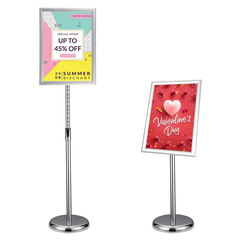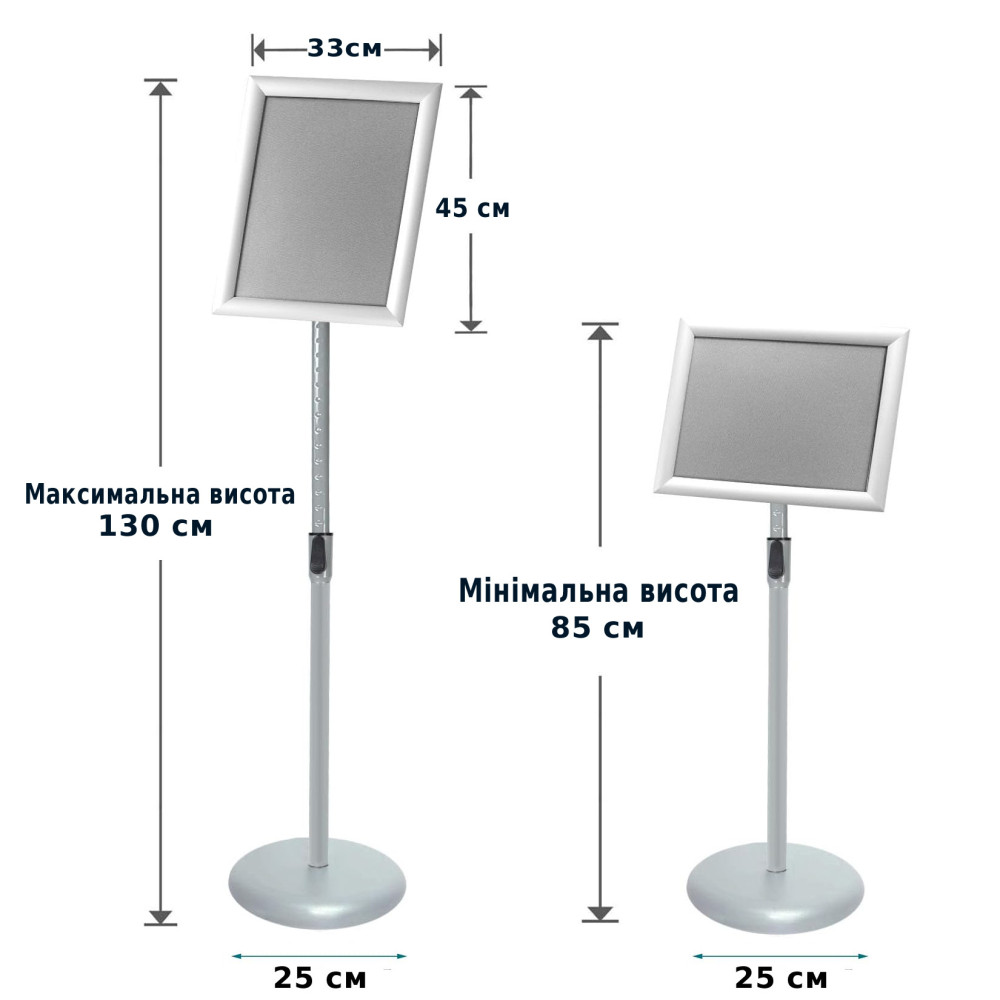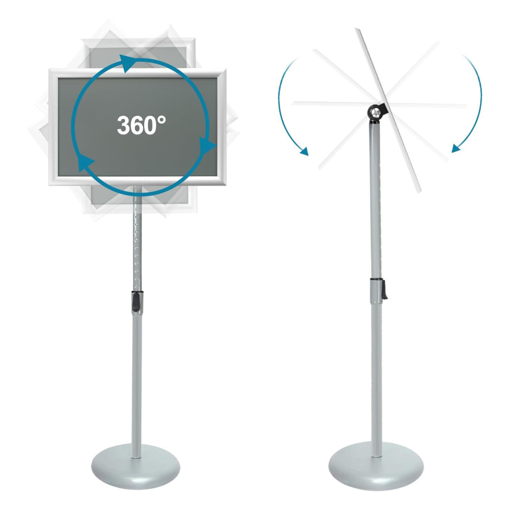 Нова модель меню-стенда має телескопічну ніжку, що дозволяє регулювати висоту стійки, а також шарнірне кріплення рамки, за допомогою якого рамку можна обертати буквально на 360 градусів, встановлюючи під будь-яким кутом як у горизонтальній, так і в у вертикальній орієнтації.