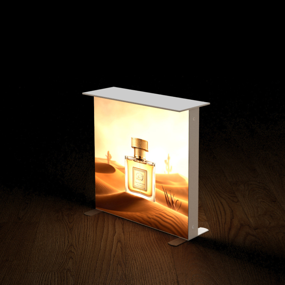 Корпус Промостолу виготовлений з алюмінієвого профілю завширшки 120 мм і забезпечений фурнітурою для легкого та швидкого монтажу без інструментів. Діоди торцевої підсвітки встановлені на верхній горизонтальній ламелі в захисному алюмінієвому каналі, що мінімізує ризик пошкодження. Підключення живлення до світлодіодів здійснюється запатентованим магнітним коннектором, зручним і виключає помилку. Полотна кріпляться до корпусу лайтбоксу та натягуються за допомогою пришитого по периметру силіконового канта. Промостіл з внутрішньою підсвіткою легко збере одна людина протягом 10 хвилин.